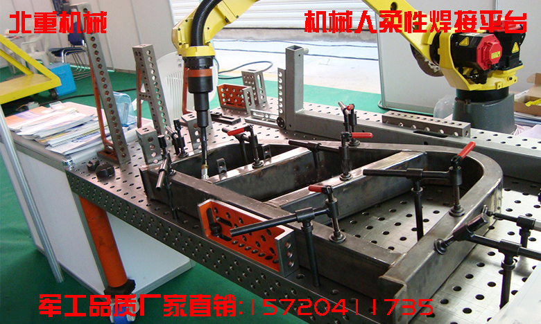 柔性組合工裝夾具是一種三維平面孔系定位夾緊系統(tǒng),采用標(biāo)準(zhǔn)化、系列化、通用化的模塊組成,所有模塊的鏈接、固定和壓緊都是以孔來定位,用鎖緊銷來實現(xiàn)快速鎖緊,模塊與模塊隨著機(jī)器人的應(yīng)用越來越廣泛,自動化程度的不斷提高,傳統(tǒng)的裝配、焊接工藝裝備已經(jīng)很難適應(yīng)生產(chǎn)的要求;經(jīng)過我們不斷的實驗創(chuàng)新,研發(fā)出機(jī)器人焊接平臺,從此提高生產(chǎn)效率、降低生產(chǎn)成本、提高產(chǎn)品質(zhì)量。利用專用夾具附件完成實現(xiàn)產(chǎn)品的高效率、低成本的生產(chǎn)。
