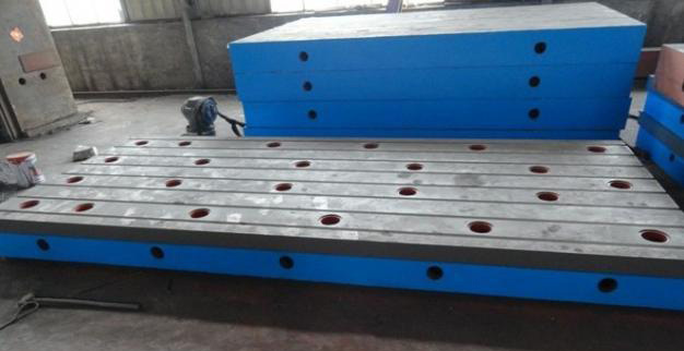 鉚焊平臺用于鉚焊工藝的基礎(chǔ)平板,工作面上有孔和T型槽,孔主要用來清理鉚焊時的一些鐵渣和焊接廢棄物,T型槽主要是用來固定焊接件。